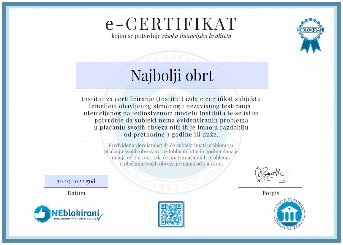Certifikatom se potvrđuje sigurnost, financijsko zdravlje i pouzdanost kao poslovnog partnera obrta i obiteljskog poljoprivrednog gospodarstva temeljem obavljenog stručnog i nezavisnog testiranja utemeljenog na jedinstvenom modelu Instituta za certificiranje.